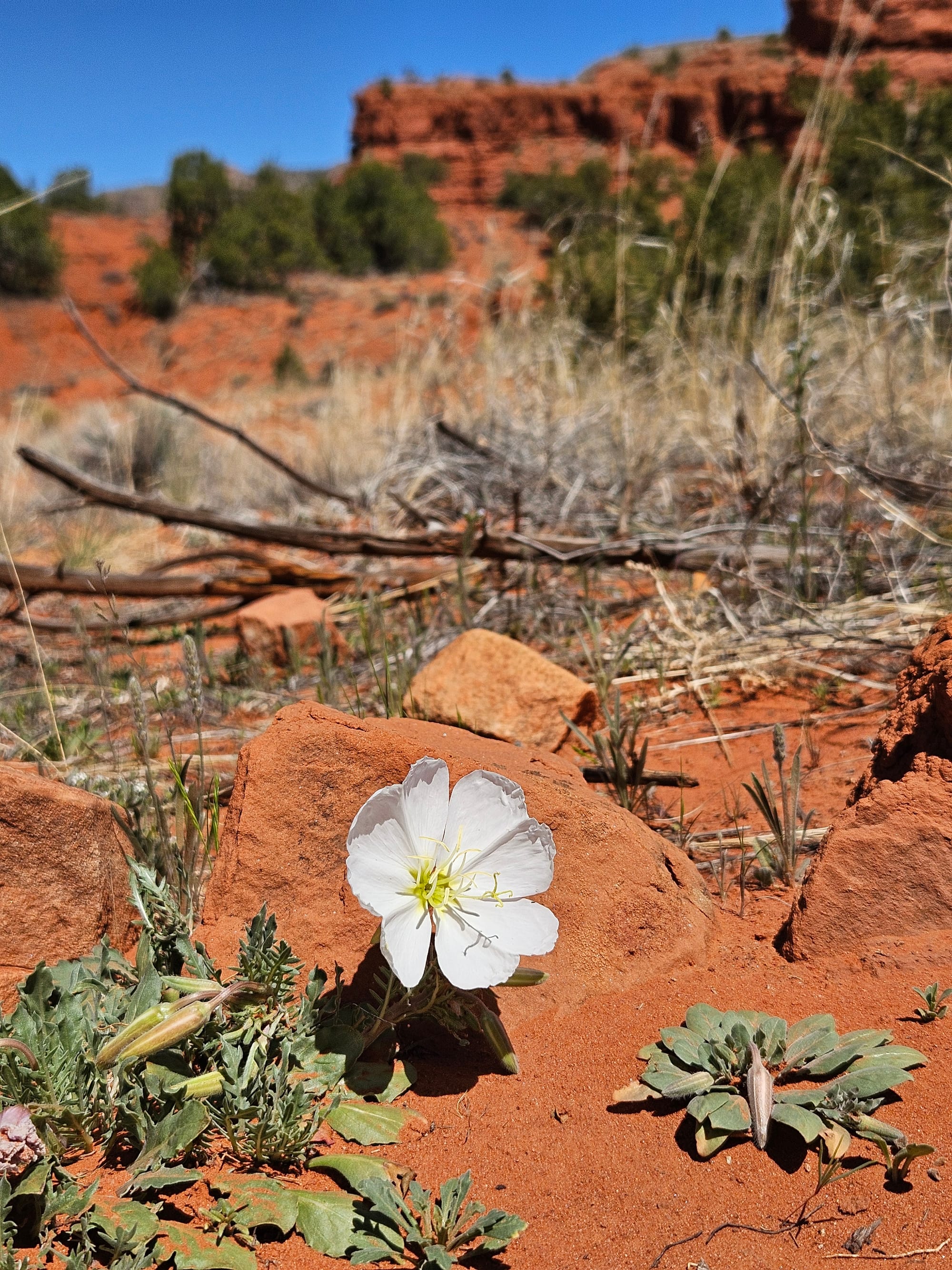 I was able to find more gorgeous solitude at the nearby Red Rock Trail, on the Jemez Pueblo (and requiring a small trail fee from the Walatowa Visitor Center to access). The sandy trail is lined with yucca plants, club-cholla cacti, juniper trees, and (thanks to recent rain) a few, startling pops of colorful flowers blooming: evening primrose, prickleaf gilia, red bluet, and Fendler’s bladdercap. The path loops around enormous rocky, bright red cliff formations in all directions, a bloody slash through the otherwise tan-colored landscape of Jemez. Eventually, you’re led into the shade of a towering slot canyon, where a few, huge ravens cackled at me from high perches overhead.